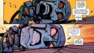 Dal punto di vista visivo, il lavoro di Ludo Lullabi risulta solido e funzionale. Il tratto bilancia chiarezza espositiva e dinamismo, elementi essenziali per rendere leggibili le coreografie meccaniche. Tuttavia, è nei momenti statici che emerge la vera capacità dell’artista: dare espressività a volti metallici, rendendo credibili le emozioni e le micro-espressioni dei personaggi. La colorazione, curata da Mike Spicer, supporta l’atmosfera con toni vibranti che accentuano l’impatto delle scene d’azione senza appesantire la lettura.