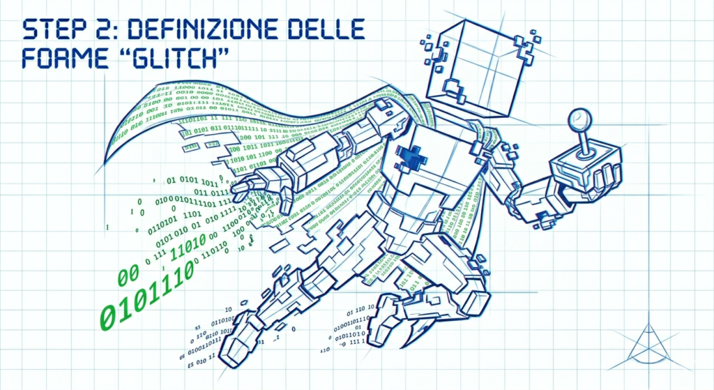 Sopra lo scheletro, aggiungi i dettagli. X-Bazzolo ha delle spalle squadrate fatte di “pixel solidi”. Disegna dei piccoli cubi che si staccano dal corpo principale (effetto frammentazione). Il braccio destro deve terminare con il “Joystick della Verità”, mentre il sinistro è composto da linee di codice semitrasparenti.